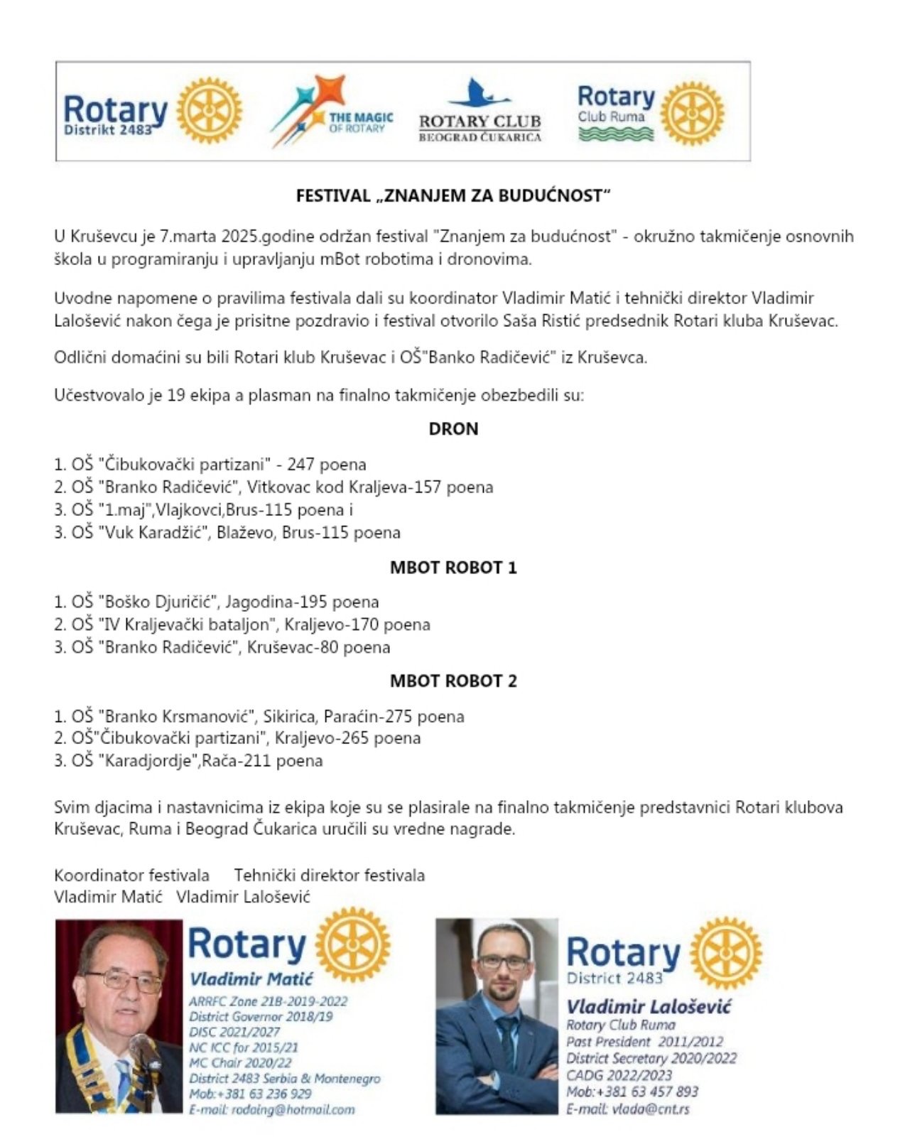 У Крушевцу је 7. марта 2025. године одржан фестивал “Знањем за будућност” – окружно такмичење основних школа у програмирању и управљању мБот роботима и дроновима.